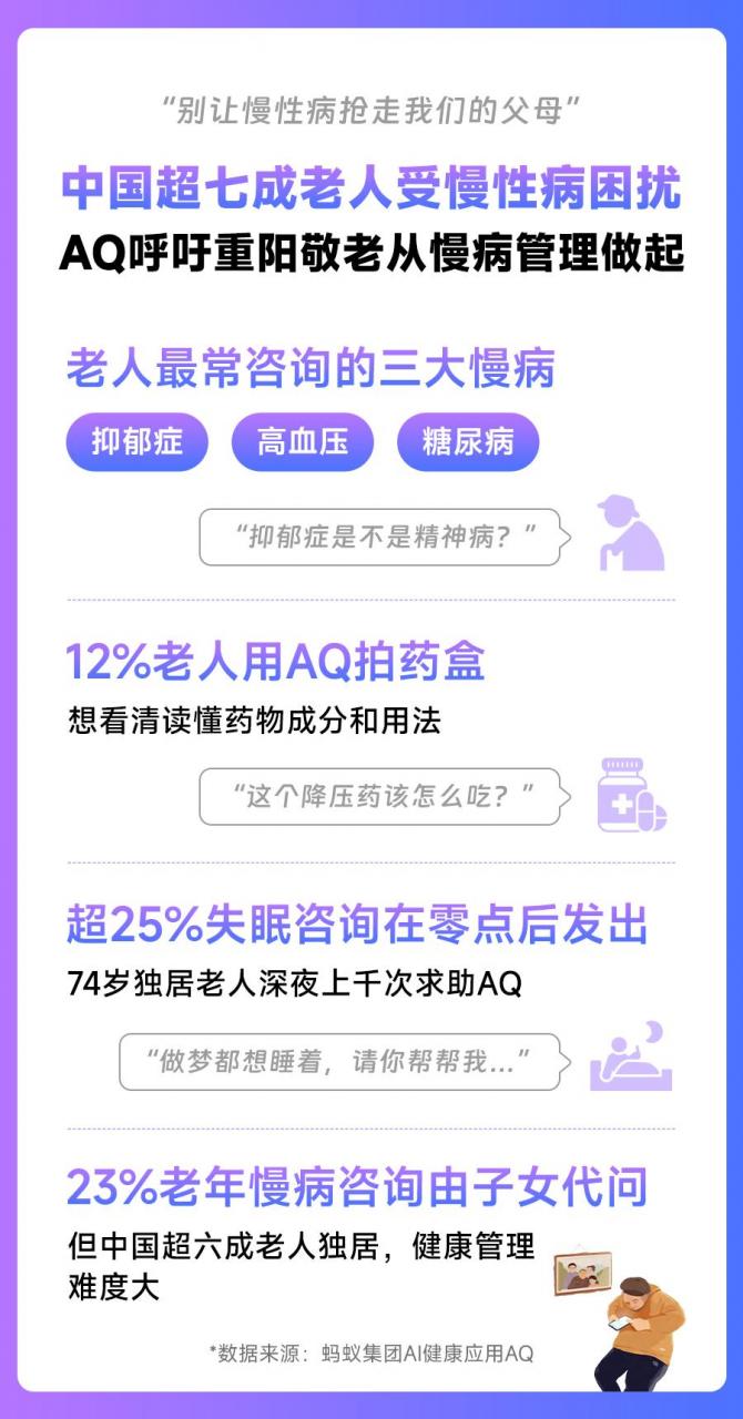 图片更让人揪心的是,很多老人的“不舒服”不止在身上,还在心里。在AQ的后台数据中,抑郁症、高血压、糖尿病,是老年人咨询量最高的三大慢性病。超过25%的老年人咨询发生在凌晨零点后。